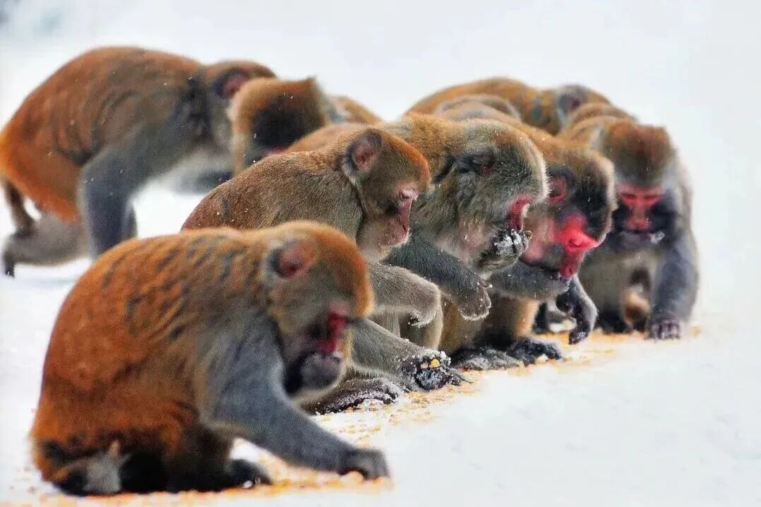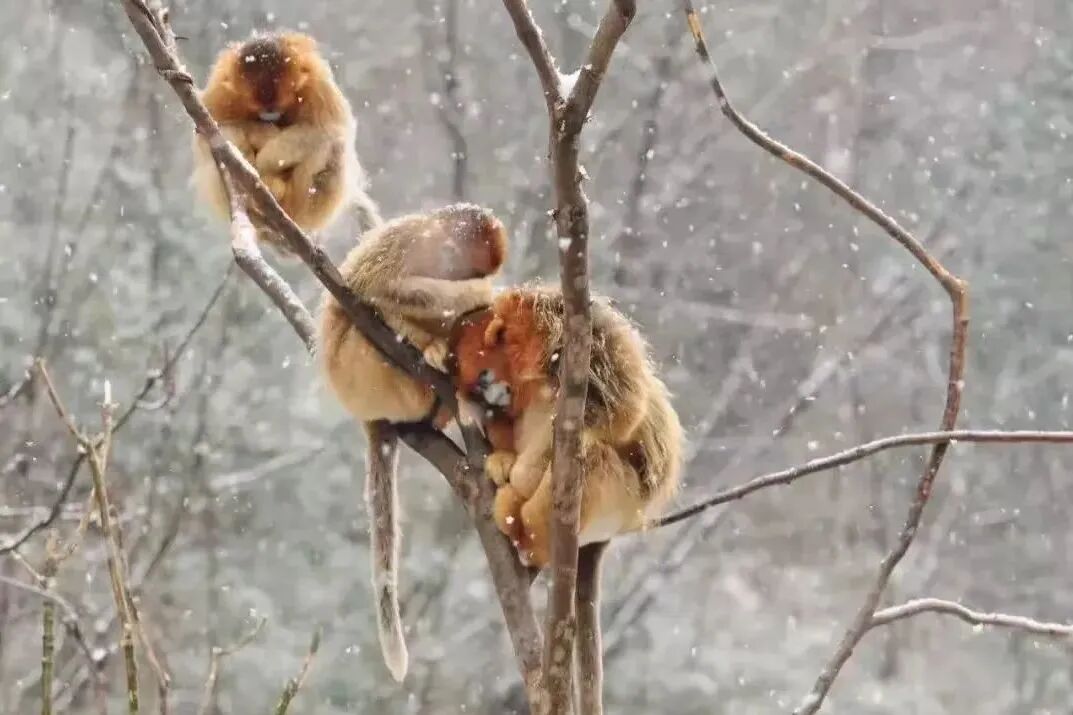 其中,川金丝猴无疑是“雪中精灵”中的颜值担当。它们身披金黄色的毛发,在皑皑白雪的映衬下,宛如跳动的火焰。成群的川金丝猴在树枝间灵活穿梭,时而相互追逐打闹,时而安静地啃食松针,那灵动的姿态让人忍不住驻足观望,随手一拍都是绝美的画面。除了川金丝猴,你还可以看到扭角羚成群结队地在河谷觅食,每一次邂逅都是大自然的馈赠。