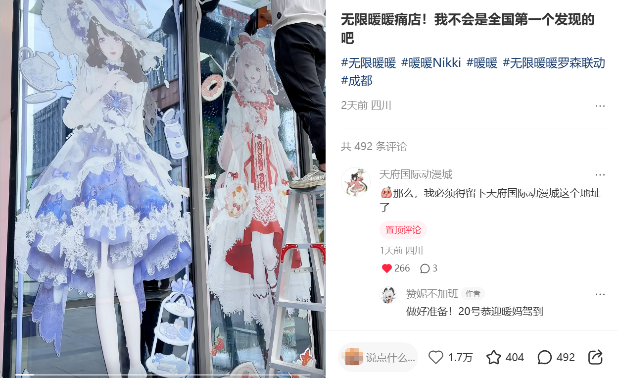 此前,有小红书网友在天府国际动漫城内便利店,拍摄到店员张贴《无限暖暖》联动门贴的画面,随手发帖,迅速引发大量年轻女性玩家关注,7000秒即获9000赞,不到一天已超1.7万赞,引起大量“暖妈”交流评论,更有网友调侃:“这扇门卖不卖?我想直接搬回家。”