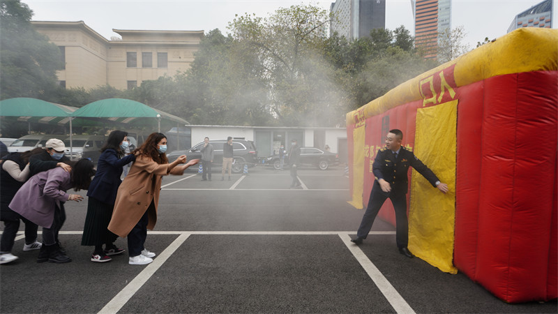 授课结束后,参训人员分两路从锦苑楼南侧和北侧安全通道撤离下楼,撤离过程严格按照“弯腰、搭肩、扶墙”的动作规范,有序快速地到达指定集合地点锦江宾馆 停车场,7人一列,分批进入逃生帐篷,在黑暗环境和浓烟下体验逃生现场。所有参演人员按照动作要领成功完成逃生。